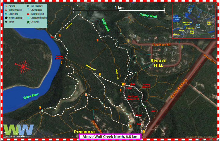 Description: We start flat (#1 to #3), then ascend to the ridge. Passing through a fire-smarted section of the forest and then to some old growth. We then ascend the ridge walking above the Yukon River, with lots of viewing, (#4 to #7) before returning to the flats and the parking lot.